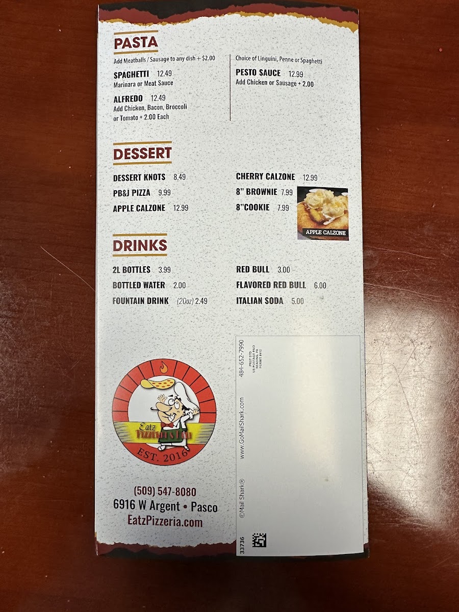 Introducing Eatz Pizzeria, a culinary gem located at 6916 W Argent Rd, Pasco, WA, this pizzeria offers an inviting menu that brings Italian flavors to life. The highlights include mouthwatering appetizers such as scrumptious Garlic Knots and Loaded Tots, perfect for sharing. The main event, of course, is the array of pizzas and strombolis brimming with fresh ingredients. Customers rave about the Greek pizza topped with chicken, and the unique Pasco pizza featuring pepperoni, pineapple, and jalapeños.